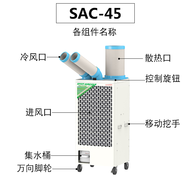 冷風(fēng)管可在一定范圍內(nèi)任意彎曲,大角度旋轉(zhuǎn)。兩根冷風(fēng)管均可左右自動擺風(fēng)。